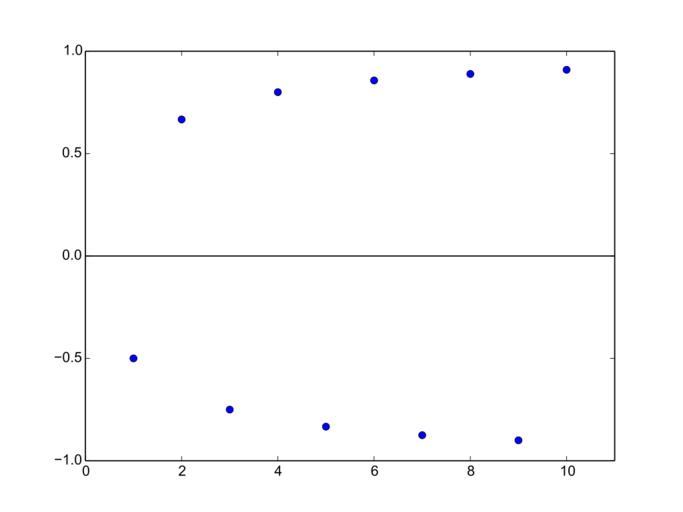 Keywords: First elements of sequence with two accumulation points.svg en First elements of the sequence <math> -1 n\cdot\frac n n+1 </math> 2015-05-29 own http //kulla me/ Stephan Kulla User Stephan Kulla other versions <gallery> File Sequence with two accumulation points subsequences colored differently svg With convergent subsequences colored </gallery> Created with Matplotlib import numpy as np import matplotlib pyplot as plt nmax 10 ns np arange 1 nmax+1 1 sgns np ones_like ns sgns 2 -1 plt plot ns sgns ns/ ns+1 o plt xlim ns0-1 ns-1+1 plt axhline 0 color black plt savefig First elements of sequence with two accumulation points svg cc-zero Uploaded with UploadWizard Sequence mathematics |