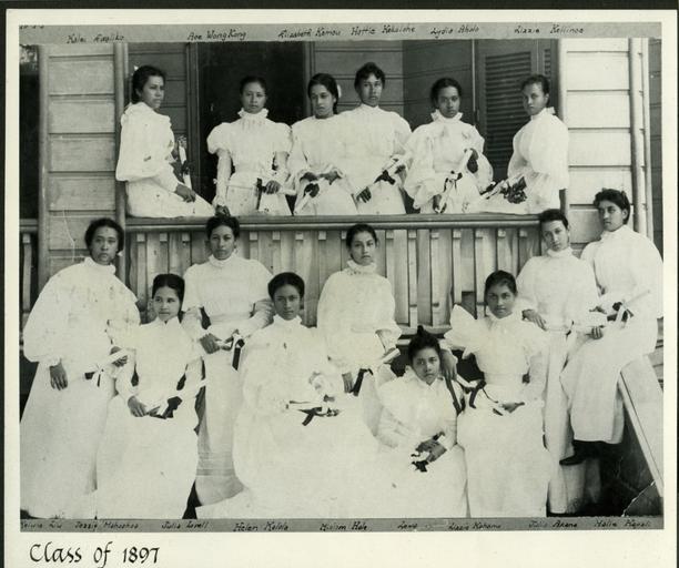 | Keywords: First Graduating Class of the Kamehameha School for Girls, 1897 (caption).jpg en Bottom row left to right Keluia Liu Jessie Mahoahoa Julia Lovell Helen Kalola Miriam Hale Lewa Iokia Elizabeth Kahanu Julia Akana Malie Kapali Top row left to right Kalei Ewaliko Aoe WongKong Elizabeth Kamau Hattie Kekolohe Lydia Aholo Elizabeth Keliʻinoi Lydia Aholo was keiki hanai of Queen Liliʻuokalani http //www ksbe edu/imua/columns/haanai-sisters-lydia-kamakaeha-and-bernice-pauahi-left-lasting-legacies/ Author ~ 1897 Native Hawaiians Black and white photographs of school class groups 1897 in Hawaii Kamehameha Schools alumni Kamehameha Schools Archives Lydia Kaʻonohiponiponiokalani Aholo PD-old |
