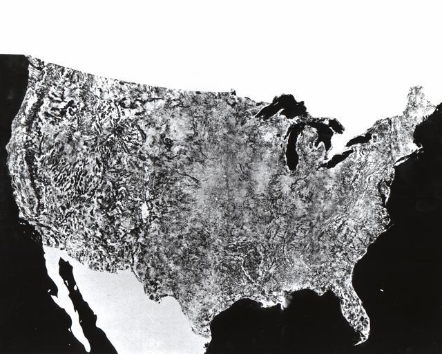 Keywords: erts earth resources technology satellite earthresourcestechnologysatellite mss multi-spectral scanner system multispectralscannersystem blackandwhite white background black and white A giant photo map of the contiguous 48 states of the United States, the first ever assembled from satellite images, completed for NASA by the U.S. Department of Agriculture Soil Conservation Service Cartographic Division. The map is 10 by 16 feet, is composed of 595 cloud-free black-and-white images returned from NASA's first Earth Resources Technology Satellite (ERTS-1). The images were all taken at the same altitude (912 kilometers: 560 miles) and the same lighting angle. The images were produced by the spacecraft's Multi-spectral Scanner System (MSS) in Band 5, or the red portion of the visible spectrum, during the period July 25 to October 31, 1972. A similar mosaic has been made using Band 7, the near infrared, of the MSS. The mosaic is produced at scale of 1:1,000,000 (one inch on the mosaic equals a million inches on the ground). Enlargements of segments of the mosaic can be made up to a scale of 1:500,000. ERTS images are used for many other purposes besides cartography, including geology, hydrology, environmental and land use studies, agriculture studies, and various other areas. A giant photo map of the contiguous 48 states of the United States, the first ever assembled from satellite images, completed for NASA by the U.S. Department of Agriculture Soil Conservation Service Cartographic Division. The map is 10 by 16 feet, is composed of 595 cloud-free black-and-white images returned from NASA's first Earth Resources Technology Satellite (ERTS-1). The images were all taken at the same altitude (912 kilometers: 560 miles) and the same lighting angle. The images were produced by the spacecraft's Multi-spectral Scanner System (MSS) in Band 5, or the red portion of the visible spectrum, during the period July 25 to October 31, 1972. A similar mosaic has been made using Band 7, the near infrared, of the MSS. The mosaic is produced at scale of 1:1,000,000 (one inch on the mosaic equals a million inches on the ground). Enlargements of segments of the mosaic can be made up to a scale of 1:500,000. ERTS images are used for many other purposes besides cartography, including geology, hydrology, environmental and land use studies, agriculture studies, and various other areas. |