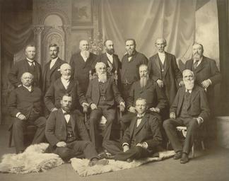 | Keywords: First Presidency and Twelve Apostles 1898.jpg The First Presidency and the Twelve Apostles Standing from left to right Anthon Hendrik Lund John William Taylor John Henry Smith Heber Jeddy Grant Francis Marion Lyman George Teasdale Marriner Wood Merrill Seated from left to right Brigham Young Jr George Quayle Cannon Lorenzo Snow Joseph F Smith Franklin Dewey Richards Front row from left to right Matthias F Cowley and Abraham Owen Woodruff At the date on this photograph September 1898 there were only eleven members of the Quorum of the Twelve Apostles Wilford Woodruff had just died Sept 2 and Lorenzo Snow was called from the Quorum to become the next president Sept 13 The vacancy in the Twelve would be filled the next month when Rudger Clawson was ordained Oct 10 Some captions or revisions to this photograph have included Clawson or Reed Smoot ordained 1900 See also other versions below Immediate image source http //contentdm lib byu edu/cdm4/item_viewer php CISOROOT /Savage2 CISOPTR 1513 CISOBOX 1 REC 10 C R Savage collection Brigham Young University call number PH 2749 Marked Copyrighted September 1898 C R Savage in the lower left corner Digital version published September 2005 at Brigham Young University Creator Charles Roscoe Savage The source states Public Domain; Courtesy Church History Collections The Church of Jesus Christ of Latter-day Saints and Intellectual Reserves Inc http //contentdm lib byu edu/cdm4/item_viewer php CISOROOT /Savage CISOPTR 1334 CISOBOX 1 REC 9 Call number MSS P 24 Item 793 is another version of this photo with Reed Smoot pasted in between Taylor and J H Smith in the back row and Rudger Clawson between Teasdale and Merrill PD-old-100 Matthias F Cowley Marriner W Merrill Lorenzo Snow Joseph F Smith John W Taylor Mormon John Henry Smith Heber J Grant George Teasdale George Q Cannon Franklin D Richards Mormon apostle Francis M Lyman Brigham Young Jr Anthon H Lund Abraham O Woodruff 1898 photographs Group photographs Apostles of The Church of Jesus Christ of Latter-day Saints Group 1898 Members of the First Presidency of The Church of Jesus Christ of Latter-day Saints Group 1898 with the Twelve Images by Charles Roscoe Savage Group portraits with 14 persons |