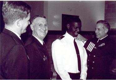 | Keywords: First US Navy Muslim Chaplain.jpeg en Imam M Noel Jr identified as such in newspaper article from which photo is taken later formally identified as Monje Malak Abd al-Muta Noel Jr or Monje Malak Abd al-Muta'Ali Jr is frocked by U S Navy Chaplain Arnold E Resnicoff in a ceremony held at the U S Naval Submarine Base New London where Noel then a chaplain-candidate was receiving training by Chaplain Resnicoff for future service in the Chaplain Corps and also participating in the base's Command Religious Program including special lectures on Islam to military personnel of all religions Frocking is a Navy ceremony where an individual who has been nominated for promotion but has not yet been officially promoted is sometimes allowed to wear the insignia for that rank although not receiving the pay or benefits accorded for it Here Chaplain Resnicoff attaches the shoulder boards of a Lieutenant junior grade to Noel's uniform while left to right Rear Admiral Richard A Buchanan Commander Submarine Group TWO and Captain Leo G Dominque Commanding Officer of the submarine base look on The Imam was commissioned as a chaplain as opposed to chaplain candidate on August 8 1996 The Dolphin official U S Naval Submarine Base New London paper Office of Public Affairs March 14 1996 U S Navy photographer Hank Buermeyer Published March 14 1996 taken sometime March 1996 Public domain unknown PD-USGov-Military-Navy United States Navy chaplains Arnold E Resnicoff Muslim chaplains |