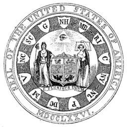 | Keywords: FirstCommitteeGreatSealObverseLossingDrawing.jpg Interpretation of the first committee's design for the obverse of the Great Seal of the United States in 1776 which was never used This was based on Pierre Eugene du Simitiere's proposal which may in turn have been somewhat based on some elements from an earlier coin design by Benjamin Franklin This interpretation was made in 1856 by Benson J Lossing and is partially incorrect -- the initials of the states are supposed to be on the shield itself in a border area The design was <blockquote><div> The shield has six Quarters parts one coupé The 1st Or a Rose enamelled gules and argent for England the 2nd Argent a Thistle proper for Scotland the 3d Vert a Harp Or for Ireland the 4th Azure a Flower de luce Or for France the 5th Or the Imperial Eagle Sable for Germany and the 6th Or the Belgic Lion Gules for Holland pointing out the countries from which these states have been peopled The shield within a bordure Gules entwined of thirteen Scutcheons Argent linked together by a chain or each charged with the initial letters Sable as follows 1st NH 2nd MB 3d RI 4th C 5th NY 6th NJ 7th P 8th DC 9th M 10th V 11th NC 12th SC 13th G for each of the thirteen independent States of America The clockwise sequence lists the states in a north-to-south geographical order 'MB' stands for 'Massachusetts Bay' 'DC' stands for 'Delaware Counties' as this state split off from Pennsylvania as having had been its lower counties Supporters Dexter the Goddess of Liberty in a corselet of Armour alluding to the present times holding in her right hand the Spear and Cap and with her left supporting the shield of the States; Sinister the Goddess of Justice bearing a sword in her right hand and in her left a Balance Crest the Eye of Providence in a radiant Triangle whose Glory extends over the shield and beyond the Figures Motto E Pluribus Unum Legend round the whole achievement Seal of the United States of America MDCCLXXVI </div></blockquote> From the The New Harper's Magazine Volume 13 Issue 74 July 1856 page 180 article http //cdl library cornell edu/cgi-bin/moa/moa-cgi notisid ABK4014-0013-24 Great Seal of the United States by Benson J Lossing 1856-07 Creator Benson John Lossing <gallery>File FirstCommitteeGreatSealReverseLossingDrawing jpg Reverse</gallery> PD-old-100 PD-US Great Seal of the United States Eyes of Providence in heraldry E Pluribus Unum Phrygian caps in heraldry Swords in heraldry Benson John Lossing |