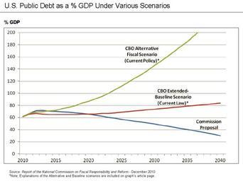 | Keywords: Fiscal Reform Commission - Public Debt Projections.png Projections by National Commission on Fiscal Responsibility and Reform<br/> Understanding the Chart The chart is from page 10 of the final report of the National Commission on Fiscal Responsibility and Reform which was issued in December 2010 The following is the chart caption in the report The Extended-Baseline Scenario generally assumes continuation of current law The Alternative Fiscal Scenario incorporates several changes to current law considered likely to happen including the renewal of the 2001/2003 tax cuts on income below 250 000 per year continued Alternative Minimum Tax AMT patches the continuation of the estate tax at 2009 levels and continued Medicare Doc Fixes The Alternative Fiscal Scenario also assumes discretionary spending grows with Gross Domestic Product GDP rather than to inflation over the next decade that revenue does not increase as a percent of GDP after 2020 and that certain cost-reducing measures in the health reform legislation are unsuccessful in slowing cost growth after 2020 <ref>http //www fiscalcommission gov/sites/fiscalcommission gov/files/documents/TheMomentofTruth12_1_2010 pdf National Commission on Fiscal Responsibility and Reform-Final Report-December 2010</ref> These scenarios are discussed in further detail in the Commissions Report and the CBO's periodic Long Term Budget Outlook reports Bear in mind also that this chart represents the public debt which excludes the intragovernmental debt http //www fiscalcommission gov/sites/fiscalcommission gov/files/documents/TheMomentofTruth12_1_2010 pdf Fiscal Commission Report-December 2010 Farcaster talk 23 01 10 April 2011 UTC graph Reflist PD-USGov Original upload log en wikipedia Fiscal+Reform+Commission+-+Public+Debt+Projections png wikitable - 2011-04-10 23 01 960×720× 33903 bytes Farcaster Projections by National Commission on Fiscal Responsibility and Reform http //www fiscalcommission gov/sites/fiscalcommission gov/files/documents/TheMomentofTruth12_1_2010 pdf ~~~~~ Uncategorized 2016 May 6 |