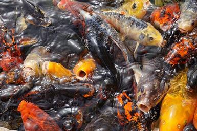 Keywords: fish pond goldfish swarm water surface swim red water luck green china biotope