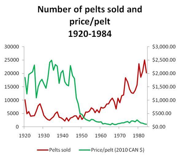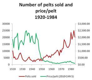 | Keywords: Fisher pelts.jpg en Graph showing number of fisher Martes pennanti sold between 1920-1984 as well as price per pelt in adjusted 2010 Canadian dollars own Photoist 2010-09-10 Martes pennanti Fur trading values Skins fisher Fisher fur-skins Fur fashion in 1984 |