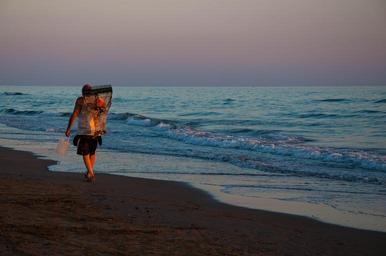 Keywords: fisherman beach people elderly walk sunset