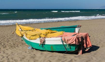 Keywords: fishing boat beach sand sea water ocean blue sky coast landscape sun andalusia spain shore scenic coastline seascape wave marine nautical
