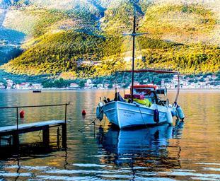 Keywords: fishing boat dawn sunrise greece sea morning landscape reflection boat water vathi pier mooring peaceful