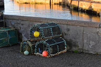 Keywords: fishing creel equipment net water basket sea lure harbor harbour lobster crab pots wood nylon commercial yellow red sunset fishing nets