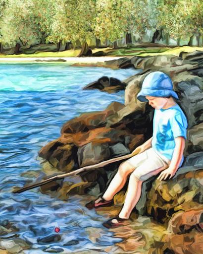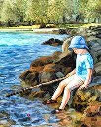 Keywords: fishing lake landscape pond autumn person child artwork art digital painting digital art waterscape outdoor decoration