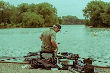 Keywords: fishing man fishing gear water trees angler outdoors leisure lake