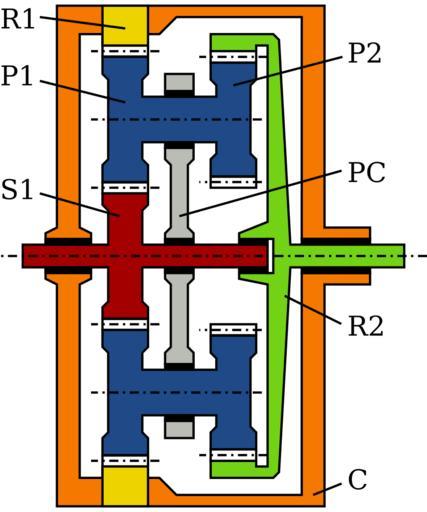 Keywords: Fixed Diff C.svg A fixed differential gear system This arrangement has a typical ratio of between 20 1 and 500 1 The ratio is given by <math>m_G \left \frac N_ R1 N_ S1 +1\right \frac N_ R2 N_ P1 N_ R2 N_ P1 -N_ R1 N_ P2 </math> where <math>N_ S1 </math> is the number of teeth on the No 1 Sun gear S1 red <math>N_ R1 </math> is the number of teeth on the No 1 Ring gear R1 yellow <math>N_ R2 </math> is the number of teeth on the No 2 Ring gear R2 green <math>N_ P1 </math> is the number of teeth on the No 1 Planet gear P1 dark blue on the left <math>N_ S2 </math> is the number of teeth on the No 2 Planet gear P2 dark blue on the right The fixed member is the No 1 Ring the input member is the Sun S1 red and the output member is the No 2 Ring self-made Inkscape 2008-03-18 Inductiveload Differential gear systems Drawings of gears and gearboxes Planetary gearing Transmissions SVG machinery |