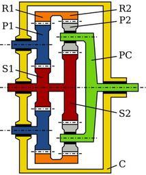 | Keywords: Fixed Diff D.svg A fixed differential gear system This arrangement has a typical ratio of between 15 1 and 100 1 The ratio is given by <math>m_G \frac 1 \frac 1 \left \frac N_ R2 N_ S2 +1\right - \frac 1 \frac N_ R1 N_ S1 \left \frac N_ S2 N_ R2 +1 \right </math> where <math>N_ S1 </math> is the number of teeth on the No 1 Sun gear S1 red on the left <math>N_ S1 </math> is the number of teeth on the No 2 Sun gear S1 red on the right <math>N_ R1 </math> is the number of teeth on the No 1 Ring gear R1 orange on the left <math>N_ R2 </math> is the number of teeth on the No 2 Ring gear R2 orange on the rightn <math>N_ P1 </math> is the number of teeth on the No 1 Planet gear P1 dark blue These gears rotate about fixed axes <math>N_ S2 </math> is the number of teeth on the No 2 Planet gear P2 grey The fixed member is the cage C yellow the input member is the No 1 Sun and the output member is the Planet Carrier PC green self-made Inkscape 2008-03-18 Inductiveload Differential gear systems Drawings of gears and gearboxes Planetary gearing Transmissions SVG machinery |