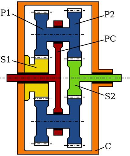 Keywords: Fixed Diff A.svg A fixed differential gear system This arrangement has all gears with external teeth and has typical ratio of between 10 1 and 50 1 The ratio is given by <math>m_G \frac N_ S2 N_ P1 N_ S2 N_ P1 -N_ S1 N_ P2 </math> where <math>N_ S1 </math> is the number of teeth on the No 1 Sun gear S1 yellow <math>N_ S2 </math> is the number of teeth on the No 2 Sun gear S2 green <math>N_ P1 </math> is the number of teeth on the No 1 Planet gear P1 dark blue on the left <math>N_ S2 </math> is the number of teeth on the No 2 Planet gear P2 dark blue on the right The fixed member is the No 1 Sun the input member is the Planet Carrier PC red and the output member is the No 2 Sun self-made Inkscape 2008-03-18 Inductiveload Differential gear systems Drawings of gears and gearboxes Planetary gearing Transmissions SVG machinery |