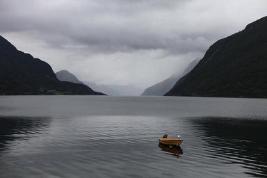 Keywords: fjord water mountains nordfjord norway boot rest silent loneliness trueb landscape cliff cliffs