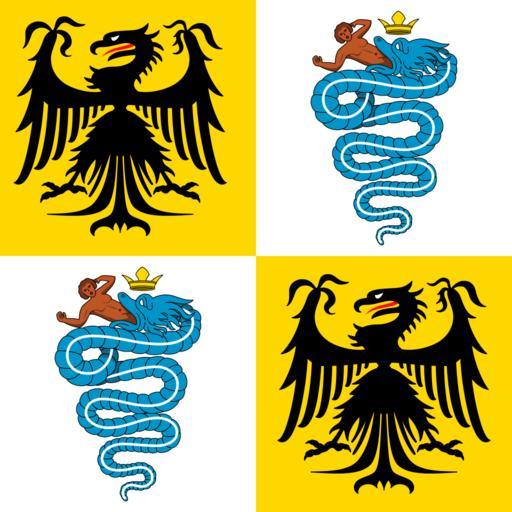 | Keywords: Flag of the Duchy of Milan (1450).svg Flag of the Duchy of Milan from about 1450 Bandiera del Ducato di Milano dal 1450 circa Bandera del Ducaa de Milan 1450 en Image I Bis 717 PNG 2008-02-10 F l a n k e r insignia F l a n k e r Black blue white yellow flags Coats of arms of the House of Sforza Duchy of Milan Flags with crowned eagles Flags with human figures Flags with snakes SVG flags - historical of Italy Eagles and snakes in art | ||||