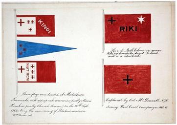 | Keywords: Flag of Maori King 1862.jpg en The three left flags have been used by Potatau Te Wherowhero as the first Maori King 1859 The flags have been used from 1857 on while the Maori king movement Gordon drew the flags 1862 when he was visiting Mataitawa Taranaki on the anniversary of Potatau's accession http //www mch govt nz/nzflag/history/images/king-flag jpg W F Gordon 1846 “1936 1862 Flags of New Zealand Maori culture Flags in art PD-old | ||||