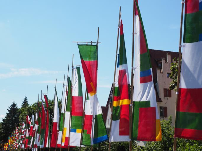 Keywords: flags colorful blow wind flutter blue red yellow danube fixed ulm