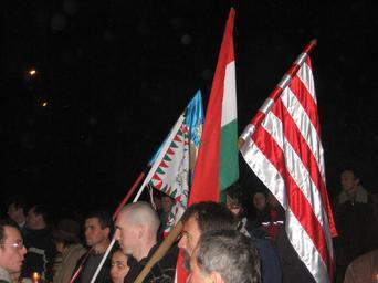 Keywords: Flags in Marosvásárhely.jpg Zászlók az EMI által rendezett marosvásárhelyi rendezvényen 2008 március 15 Own 2008 Kulja public Székely martyrs' sculpture Târgu Mureș