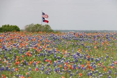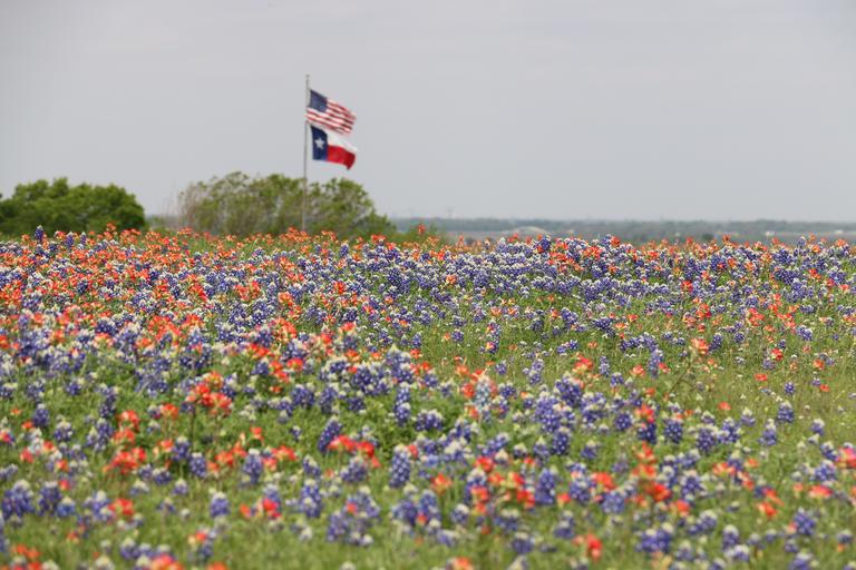 Keywords: flags texas flag us flag american flag field of flowers wildflowers spring springtime patriotic bluebonnets indian paintbrush landscape