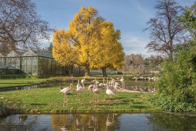 Keywords: flamingo animals birds species nature pink water bird zoo exotic animal world wildlife photography creature feather pinnate pink flamingo bill water stand tiergarten tree autumn leaves golden colorful golden autumn avenue away