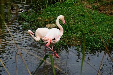 Keywords: flamingo pink bird wader pair water long legs long beak tropical wild detail