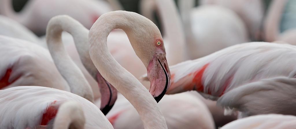 Keywords: flamingo portrait greater flamingo phoenicopterus roseus bird pink wading wader wildfowl waterfowl eye beak neck curve curved plumage feather group social wetlands aquatic