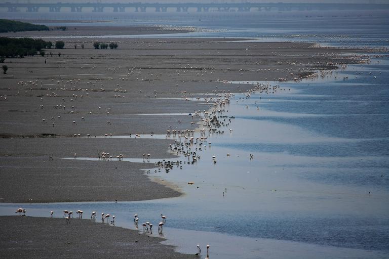 Keywords: flamingos bird feeding marsh creek tidal fauna