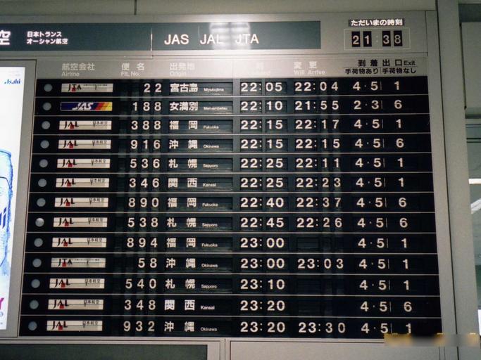 | Keywords: Flap board Tokyo Intl Airport Arrival.jpg  Tokyo International Airport Arrival lobby Photo by Cassiopeia_sweet 2003-10-09 Cassiopeia_sweet Haneda Airport Terminal 1 Split-flap flight information display systems Split-flap displays in public transport in Japan Flight information display systems in Japan Public digital clocks in Japan |