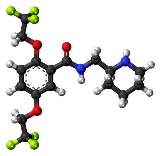| Keywords: Flecainide 3D ball.png Ball-and-stick model of the flecainide molecule an antiarrhythmic agent Colour code 505050 Carbon C black<br> F0F0F0 Hydrogen H white<br> F51E1E Oxygen O red<br> 3C50FA Nitrogen N blue<br> C8FA00 Yellow-green Fluorine F<br> 2011-07-03 own DS Visualizer Jynto talk Space-filling version cc-zero Images by Jynto Ball-and-stick models Antiarrhythmic agents trifluoromethyl compounds Benzamides Phenol ethers Piperidines | ||||
