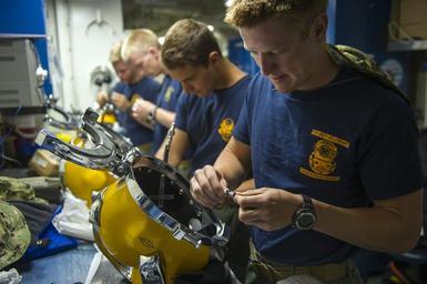 | Keywords: Fleet Readiness Training Program 130617-N-YD328-010.jpg en Navy Diver Seaman Garrett Mucillo assigned to Mobile Diving and Salvage Unit Two MDSU2 assembles a Mark V Kirby Morgan diving helmet aboard USNS Grasp T-ARS-51 during MDSU2's Fleet Readiness Training Program FRTP in Key West Fla FRTP is an ongoing two-year training pipeline encompassing all required skills for a MDSU2 company deployment Training aboard USNS Grasp is conducted with members of the Military Sealift Command who operate the ship and provide support for the Navy Divers U S Navy photo by Mass Communication Specialist 3rd Class Nicholas S Tenorio/Released 2013-06-17 Petty Officer 3rd Class Nicholas Tenorio https //www dvidshub net/image/959569 130617-N-YD328-010 2013-06-24 13 17 KEY WEST FL US 3 PD-USGov-Military-Navy United States Navy Mobile Diving and Salvage Unit Two Images from DoD uploaded by Fæ |