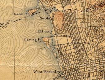 | Keywords: fleming point flemingpoint albany california map albany bulb albanybulb texture A 19th century map showing the Point, the (now-removed) hill, the (now-disintegrating) pier, the (now-filled-in) slough, and the town or area then known as Fleming. Wikipedia says, "Fleming Point is a rocky promontory in the U.S. state of California. It is situated in Albany, on the eastern shore of San Francisco Bay. Albany Bulb is an extension of the point, having been formed in the 1960s from construction debris. Fleming Point is named after John T. Fleming who lived in the area in 1853, having bought the land from Jose Domingo Peralta. In the 19th century, it was the site of the Judson Dynamite and Powder Company; the Point Fleming Powder Plant exploded in 1883. By the early 20th century, it was used by residents of Berkeley as a garbage dump. It is currently the site of Golden Gate Fields. Coordinates: 37.8858°N 122.3144°W" The city of Albany website says "A large area of the East Bay, including what is now the Albany waterfront – consisting mostly of a large salt marsh and an island called El Cerrito del Sur – was granted to Luís Maria Peralta in 1820 by the Spanish governor who controlled the region at the time. The Peralta family sold the island (which is now the site of the Golden Gate Fields grandstand) to John Fleming and what is left of that parcel is known today as Fleming Point. In 1879, the Giant Powder Company, suppliers of dynamite to the gold miners of the Sierra, selected Fleming Point as the company’s location after frequent accidental explosions made the company unwelcome in San Francisco. Dynamite factories dominated the Albany waterfront until 1905 when they were replaced with less explosive chemical factories." John CoastRanger on flickr.com writes, "1879 A plant opened on Fleming Point to produce explosives for use in gold mining. The operation was notorious for numerous accidental explosions...Late 1930’s A horsetrack operator was granted a lease from the State to build a track on Fleming Point. The Point’s bedrock hill was blasted away during construction of the track and the northern parking lot. The lot was created by filling marsh with rock and soil removed from the Point. Fleming Point is one of the only remaining segments of San Francisco Bay’s original shoreline." A photo of the pier and the Powder company on the now-removed hill in 1880, along with a description of the 1882 blast ("so large, that most of the plate glass windows were broken in Berkeley and at the University") is at www.berkeleyhistoricalsociety.org/uploads/newsletters/201.... A "people's history" of the area with this map is at patch.com/california/albany/a-peoples-history-of-the-alba... A 19th century map showing the Point, the (now-removed) hill, the (now-disintegrating) pier, the (now-filled-in) slough, and the town or area then known as Fleming. Wikipedia says, "Fleming Point is a rocky promontory in the U.S. state of California. It is situated in Albany, on the eastern shore of San Francisco Bay. Albany Bulb is an extension of the point, having been formed in the 1960s from construction debris. Fleming Point is named after John T. Fleming who lived in the area in 1853, having bought the land from Jose Domingo Peralta. In the 19th century, it was the site of the Judson Dynamite and Powder Company; the Point Fleming Powder Plant exploded in 1883. By the early 20th century, it was used by residents of Berkeley as a garbage dump. It is currently the site of Golden Gate Fields. Coordinates: 37.8858°N 122.3144°W" The city of Albany website says "A large area of the East Bay, including what is now the Albany waterfront – consisting mostly of a large salt marsh and an island called El Cerrito del Sur – was granted to Luís Maria Peralta in 1820 by the Spanish governor who controlled the region at the time. The Peralta family sold the island (which is now the site of the Golden Gate Fields grandstand) to John Fleming and what is left of that parcel is known today as Fleming Point. In 1879, the Giant Powder Company, suppliers of dynamite to the gold miners of the Sierra, selected Fleming Point as the company’s location after frequent accidental explosions made the company unwelcome in San Francisco. Dynamite factories dominated the Albany waterfront until 1905 when they were replaced with less explosive chemical factories." John CoastRanger on flickr.com writes, "1879 A plant opened on Fleming Point to produce explosives for use in gold mining. The operation was notorious for numerous accidental explosions...Late 1930’s A horsetrack operator was granted a lease from the State to build a track on Fleming Point. The Point’s bedrock hill was blasted away during construction of the track and the northern parking lot. The lot was created by filling marsh with rock and soil removed from the Point. Fleming Point is one of the only remaining segments of San Francisco Bay’s original shoreline." A photo of the pier and the Powder company on the now-removed hill in 1880, along with a description of the 1882 blast ("so large, that most of the plate glass windows were broken in Berkeley and at the University") is at www.berkeleyhistoricalsociety.org/uploads/newsletters/201.... A "people's history" of the area with this map is at patch.com/california/albany/a-peoples-history-of-the-alba... |