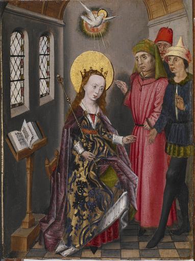 | Keywords: Flemish - Part of an Altarpiece with Three Scenes from the Life of Saint Catherine - Walters 372486.jpg Catherine of Alexandria was one of the most popular saints in medieval western Europe Legend describes her as a wise and beautiful virgin of noble birth who was executed for being a Christian This image and its two associated panels Walters 37 2487 and 37 2488 show Catherine confronting the Roman emperor converting the learned pagans who were supposed to disprove her Christian beliefs and with the help of the Holy Spirit confounding a second group of scholars sent to visit her in prison The panels were once part of a triptych placed behind a church altar where the entire story of Catherine's martyrdom was illustrated ca 1480 Late Medieval oil on panel cm 20 7 15 2 Framed cm 25 4 20 32 2 86 accession number 37 2486 27654 Leopold Blumka New York prior to 1943 by purchase Dr R Walter Graham Jr Baltimore 1971 by purchase Walters Art Museum Gift of Dr R Walter Graham Jr 1972 Illuminated Manuscripts Masterpieces in Miniature The Walters Art Gallery Baltimore 1984-1985 Time Sanctified The Book of Hours in Medieval Art and Life The Walters Art Gallery Baltimore 1988 Realms of Faith Medieval and Byzantine Art from the Walters Art Museum Museum of Biblical Art New York; Colby College Museum of Art Waterville; Joslyn Art Museum Omaha 2008-2009 From Van Eyck to Dürer Artistic Exchanges between the Netherlands and Centeral Eastern and Northern Europe c 1420-1530 Groeningemuseum Brugge 2010-2011 place of origin Flanders Belgium Walters Art Museum license 2D Medieval art in the Walters Art Museum Flemish paintings in the Walters Art Museum Media contributed by the Walters Art Museum needs category review Paintings of Saint Catherine of Alexandria Triptych Altarpiece with Scenes from the Life of Saint Catherine |