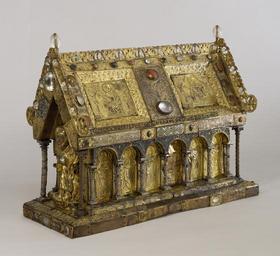 | Keywords: Flemish - Shrine of Saint Amandus - Walters 539 - Three Quarter.jpg This large church-shaped shrine once housed the relics of a 7th-century saint who served as a missionary and bishop to the western regions of present-day Belgium St Amandus d 679 also established a monastery at Elnon near Tournai western Belgium where the monks later commissioned this reliquary to honor his remains The shrine of St Amandus ornamented with silver columns and gilded apostles was the focus of a strong local cult visited by pilgrims who came for healing or in thanks for prayers answered Given its large size and popularity the shrine was probably placed upon a platform supported by columns behind the main altar for year-round veneration early 13th century with later additions Medieval wood oak gilded copper silver brass champlevé enamel cloisonné enamel rock crystal and semiprecious stones H at top of finials 19 1/4 x W 25 1/4 x D 11 15/16 in 48 9 x 64 14 x 30 32 cm accession number 53 9 22284 Brimo de Laroussilhe Paris date and mode of acquisition unknown Henri Daguerre Paris date and mode of acquisition unknown Henry Walters Baltimore September 3 1930 by purchase Walters Art Museum Henry Walters Acquired by Henry Walters 1930 Transcription In black enamel on gilt copper strips placed along the base of the roof-like lid IN ISTA CAPSA SVNT SEQVENTES RELIQ VIA E B EATI AMANDI EP ISCOPU S; Translation In this reliquary are the following relics of the blessed Bishop Amandus; Transcription In black enamel on gilt copper strip placed along the base of the roof-like lid PROESENTIS COMPOSITIVS Reliquaries and Ritual Medieval Objects of Devotion The Walters Art Gallery Baltimore 1984-1985 The Book of Kings Art War and the Morgan Library's Medieval Picture Bible The Walters Art Museum Baltimore; Academy of the Arts Easton Easton; Princeton University Art Museum Princeton; The Mitchell Gallery Annapolis; Williams College Museum of Art Williamstown 2002 The Special Dead A Medieval Reliquary Revealed The Walters Art Museum Baltimore 2008-2009 Treasures of Heaven The Cleveland Museum of Art Cleveland; The Walters Art Museum Baltimore; The British Museum London 2010-2011 place of origin Elnone Monastery in Tournai Belgium Walters Art Museum license Reliquary chest of Saint Amand Media contributed by the Walters Art Museum needs category review |