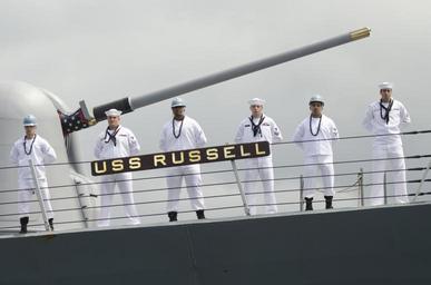 | Keywords: Flickr - Official U.S. Navy Imagery - USS Russell arrives at Joint Base Pearl Harbor-Hickam..jpg JOINT BASE PEARL HARBOR-HICKAM April 23 2012 Sailors man the rails of the guided-missile destroyer USS Russell DDG 59 as the ship arrives at Joint Base Pearl Harbor-Hickam following completion of an eight-month deployment to the western Pacific and Arabian Gulf Russell and her crew of nearly 300 Sailors conducted a wide range of operations including ballistic missile defense maritime security operations and oil platform defense Additionally the ship and her crew participated in multi-national exercises with NATO allies and Gulf partner nations in support of theater security cooperation and operations U S Navy photo by Mass Communication Specialist 2nd Class Mark Logico/Released 120423-N-WP746-058 Join the conversation http //www facebook com/USNavy www facebook com/USNavy http //www twitter com/USNavy www twitter com/USNavy http //navylive dodlive mil navylive dodlive mil http //www flickr com/photos/usnavy/6967254108/ USS Russell arrives at Joint Base Pearl Harbor-Hickam 2012-04-23 11 08 http //www flickr com/people/56594044 N06 Official Navy Page from United States of America Mark Logico/U S Navy U S Navy photo PD-USGov-Military-Navy Official U S Navy Imagery http //flickr com/photos/56594044 N06/6967254108 2012-11-13 18 51 00 cc-by-2 0 Images from United States Navy to check |