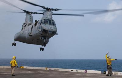 | Keywords: Flickr - Official U.S. Navy Imagery - Sailor's guide a helicopter on to the flight deck..jpg ARABIAN SEA Feb 25 2012 Aviation Boatswain ™s Mate Handling Airman Amadou Diallo guides a CH-46E Sea Knight helicopter assigned to Marine Medium Helicopter Squadron HMM 268 Reinforced off the flight deck of the amphibious transport dock ship USS New Orleans LPD 18 New Orleans and embarked Marines assigned to the 11th Marine Expeditionary Unit 11th MEU are operating in the U S 5th Fleet area of responsibility as part of the Makin Island Amphibious Ready Group U S Navy photo by Mass Communication Specialist 2nd Class Dominique Pineiro/Released 120225-N-PB383-199 http //www flickr com/photos/usnavy/6816158252/ Sailor's guide a helicopter on to the flight deck 2012-02-25 10 12 http //www flickr com/people/56594044 N06 Official Navy Page from United States of America MC2 Dominique Pineiro/U S Navy U S Navy photo PD-USGov-Military-Navy Official U S Navy Imagery http //flickr com/photos/56594044 N06/6816158252 2012-11-13 22 53 31 cc-by-2 0 Images from United States Navy to check |