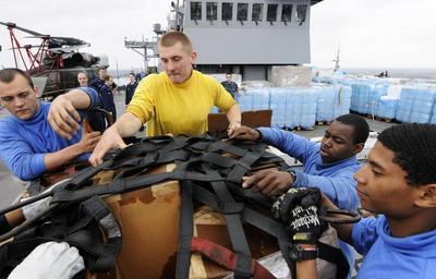 | Keywords: Flickr - Official U.S. Navy Imagery - Sailors stage pallets of humanitarian assistance aboard USS Blue Ridge..jpg EAST CHINA SEA March 20 2011 ” Seaman Kameron Maison left Culinary Specialist 3rd Class Drew Iverson Aviation Ordnanceman Airman Brandon Frasier and Seaman Nicholas Constable stage pallets of humanitarian assistance and disaster relief supplies aboard 7th Fleet command ship USS Blue Ridge LCC 19 for transfer during a replenishment at sea Blue Ridges staged supplies in preparation to support humanitarian aid and disaster relief efforts in Japan Blue Ridge is commanded by Capt Rudy Lupton and serves under Commander Expeditionary Strike Group ESG 7/Task Force CTF 76 the Navy's only forward deployed amphibious force Blue Ridge is the command flagship for Commander U S 7th Fleet Task Force 76 is headquartered at White Beach Naval Facility Okinawa Japan with an operating detachment in Sasebo Japan U S Navy photo by Mass Communication Specialist 1st Class Josh Huebner /Released http //www flickr com/photos/usnavy/5567790835/ Sailors stage pallets of humanitarian assistance aboard USS Blue Ridge 2011-03-28 11 21 http //www flickr com/people/56594044 N06 Official Navy Page from United States of America MC1 SW Josh Huebner/U S Navy Attribution License XMP-photoshop Source Navy Visual News Service PD-USGov-Military-Navy Official U S Navy Imagery http //flickr com/photos/56594044 N06/5567790835 2012-11-15 14 58 18 cc-by-2 0 Images from United States Navy to check |