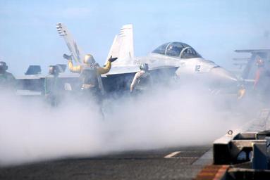 | Keywords: Flight cycles aboard USS Ronald Reagan DVIDS129566.jpg en As the steam pours out of the Nimitz-class aircraft carrier USS Ronald Regan's catapults an aviation boatswain's mate handling ABH directs the next aircraft in position for launch ABHs are tasked with the safe directing of aircraft around the flight deck and hangar bays The Ronald Reagan Carrier Strike Group is on a routine deployment in the 7th Fleet area of responsibility Operating in the Western Pacific and Indian Ocean the U S 7th Fleet is the largest of the forward-deployed U S fleets covering 52 million square miles with approximately 50 ships 120 aircraft and 20 000 Sailors and Marines assigned at any given time 2008-11-14 Petty Officer 2nd Class Gary Prill https //www dvidshub net/image/129566 081114-N-+++++-097 2008-11-18 07 06 USPACOM AT SEA PD-USGov-Military-Navy F/A-18 Hornet launches from USS Ronald Reagan CVN-76 Images from DoD uploaded by Fæ Aviation Boatswain's Mates Handlers |