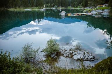 Keywords: flims graubünden switzerland caumasee pedal boat pedalo web forest nature water away lake rest still water nature conservation mirroring waters forest path trail tree landscape clouds reflection sky evening summer abendstimmung mood
