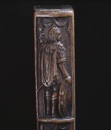 | Keywords: Flintlåsbössa av fransk-nederländsk typ ca 1650, stock av Johan Eberhart Sommer, Künzelsau - Livrustkammaren - 21713.tif Publius Cornelius Scipio Africanus konsul plain text Rund slätborrad pipa av stål godstjocklek vid mynningen 0 8 mm Åttsidig kammaren vid övergången en smal ring kanterna fasade 12 mm bakom ringen vid pipbasen likaså en profilerad vulst på de tre övre faserna Därframför ett dekorfält i stålsnitt l 110 mm nästan hela fältet förgyllt baktill ett snäckliknande ornament med två nedhängande bladfestonger Därframför tre ryttare alla i rustning den i mitten barhuvad fas fältherrestav i h hand den h ryttaren har stav i v hand och fana i h den v ryttaren likaså fana båda hjälmklädda Ornamentfältet framtill avslutad med liknande snäckornament med bladfestonger kompletterade med bladknippe i mitten Rektangulärt svansskruvblad svagt böjt med bladdekor i stålsnitt <br/>Riktmedel Hjärtformigt sikte av förgylld mässing stolpkorn av mässing <br/>Fästning Pipan fäst med krysskruv underifrån dold av avtryckarblecket samt tre pipstift av stål <br/><br/>Flintlås med plant låsbleck delvis något fasade kanter dekor i stålsnitt på låsblecket bakom hanen ryttare i 1600-talsdräkt med fältherrestav i bakgrunden stad till h om hanen tillbakaseende fältherre till häst i bakgrunden tält S-formig platt hane med små rundade käkar överkäken lös graverad och punsad drakdekor rundat koniskt käkskruvhuvud hanskruv med huvud täckande hela hankroppen stålsnittsdekor i form av blomma Fängpanna med liten fals på gaveln sicksackdekor Batteri med rektangulärt eldstål med rundad överkant liten profilering nertill på ryggen Batterifjäder utan studel litet sexflikigt fjäderlöv Nöt utan studel <br/>Fästning Två låsskruvar <br/>C-formig avtryckare Rektangulärt avtryckarbleck <br/><br/>Helstock av valnöt med kolv av tidig fransk typ På kolvens h och undersida snidad dekor på h sida stridsscen täckande hela sidan ryttare i antikiserande rustningar och i förgrunden till v en på marken sittande skäggig krigare som stöttas av två krigare och framför honom en yngre man som håller en häst vid tygeln Längs nederkanten en inskuren latinsk text Scipio cui magnum dives dedit Affrica nomen // pugnantem ad Trebia litus mane patrem samt i ny spalt till h Eximit ingenti pressum discrimine belli // Iam puer et tuta sub statione locat Scipio som det rika Afrika gav ett stort namn giver redan såsom gosse den tidigt vid Trebias strand kämpande fadern ett säkert hägn och borttager honom från det genom ofantliga faror tryckande kriget Längst till höger signering Iohan EberHart // Somer Kolvens undersida svagt rundad två rektangulära fält båda med krigare i helfigur det bakre med en man sedd snett bakifrån huvudet profil h på huvudet ett lejonhuvud med manen hängande ner på ryggen antik rustning och kort mantel h hand håller i oval sköld v arm upplyft och håller i stav Herkules Det främre fältets man likaså sedd snett bakifrån huvudet profil v antik rustning med hjälm o plym ingen mantel gehäng med svärd v hand vilar på höften h håller en på marken stödd sköld Framför de två fälten en i bladverk övergående maskaron Hela stocken i övrigt dekorerad med rankverk av silvertråd med blad och blommor av graverade pärlmorplattor På anslaget i rankverket dessutom 17 fåglar av olika slag däribland en uggla och fem påfåglar i mitten en med uppfälld stjärt Belag av graverat silver bakplåt fäst med sju stålspikar runt spikarna samt mitt på bakplåten graverade blad Två släta rörkor samt näsband med blomdekor Varbygel av stål med korta släta armar främre stolpen kluben och främre armen har del även bakom stolpen litet flikigt löv baktill På bygeln en hillebardiär i låg relief <br/><br/>Tillbehör <br/>Laddstock av stockens trä l 1142 mm framtill skodd med silver l 27 mm med geometrisk dekor I andra änden spår av annat beslag original caption ca 1650 walnut e3 - eldvapen - stock material valnöt - steel e127 - eldvapen - pipa lås och stockbeslag material stål - silver thread e8 - eldvapen - stockdekor material silvertråd - silver e7 - eldvapen - stockbeslag material silver - mother-of-pearl e8 - eldvapen - stockdekor material pärlemor - brass e4 - eldvapen - riktmedel material mässing g 2520 size mm 1162 pipa size mm 1555 LRK Künstlerfamilie Sommer 1985 Scipio cui magnum dives dedit Affrica nomen // pugnantem ad Trebia litus mane patrem // Eximit ingenti pressum discrimine belli // Iam puer et tuta sub statione locat anv e3 - eldvapen - stock; Elin Thegerström Iohan EberHart // Somer anv e8 - eldvapen - stockdekor; Johan Eberhard Sommer Scipio cui magnum dives dedit Affrica nomen // pugnantem ad Trebia litus mane patrem // Eximit ingenti pressum discrimine belli // Iam puer et tuta sub statione locat anv e3 - eldvapen - stock; Elin Thegerström Iohan EberHart // Somer anv e8 - eldvapen - stockdekor; Johan Eberhard Sommer place of origin original filename lm_t04269_18794 55357 inventory number LRK 18794 21713 CC-BY-SA <gallery caption Different images of same object > File Flintlåsbössa av fransk-nederländsk typ ca 1650 stock av Johan Eberhart Sommer Künzelsau - Livrustkammaren - 43890 tif File Flintlåsbössa av fransk-nederländsk typ ca 1650 stock av Johan Eberhart Sommer Künzelsau - Livrustkammaren - 81541 tif File Flintlåsbössa av fransk-nederländsk typ ca 1650 stock av Johan Eberhart Sommer Künzelsau - Livrustkammaren - 64420 tif File Flintlåsbössa av fransk-nederländsk typ ca 1650 stock av Johan Eberhart Sommer Künzelsau - Livrustkammaren - 72982 tif File Flintlåsbössa av fransk-nederländsk typ ca 1650 stock av Johan Eberhart Sommer Künzelsau - Livrustkammaren - 77798 tif File Flintlåsbössa av fransk-nederländsk typ ca 1650 stock av Johan Eberhart Sommer Künzelsau - Livrustkammaren - 13151 tif File Flintlåsbössa av fransk-nederländsk typ ca 1650 stock
