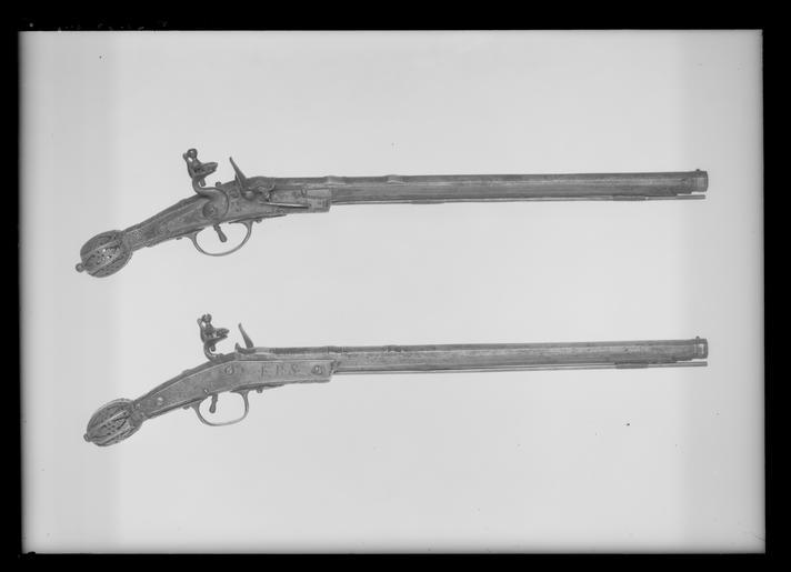 Keywords: Flintlåspistol, ändrad på 1680-talet från snapplås, skotsk typ B, James Low, Dundee 1629 - Livrustkammaren - 52993.tif Åttsidig slätborrad pipa av stål den översta fasen smal omgiven av två bredare något rundade faser Nästan helt utplånad graverad dekor med rester av förgyllning bl a fyra rosor Vid pipbasen har möjligen funnits ett årtal enl inv 1867 möjligen 1629 9 delvis synligt Därframför ursprungligen tre vulster av silver b ca 15 mm silvret på de två främre borta Mellan de två främre är pipan rund på översidan därpå graverat en tom vapensköld med hjälm och hjälmtäcke Vid mynningen en åttsidig ring av silverbleck b 8 mm <br/>Riktmedel Igenom silverringen vid mynningen ett knoppkorn av stål Pipbasen förstärkt på översidan däri nerfilat en siktskåra <br/>Fästning Svansskruv av stål med svansskruvblad dolt av kolvplåten På pipans undersida två inlaxade hakar bakom den främre en laxning för en tredje hake Under kammaren dessutom ett trasigt ringformigt häfte <br/><br/>Flintlås ändrat på 1680-talet enl Hayward från skotskt snapplås av äldre typ placerat på v sida Plant låsbleck av mässing l 160 mm fasade kanter Nästan utplånad graverad dekor framför hanen en delvis utplånad stämpel rektangel och däri L jfr nr 4371 - I L och sexuddig stjärna Hålen efter snapplåsets delar igensatta med mässing Flintlåsets delar av stål S-formig hane med välvd kropp motstöd på hanhalsen Graverad dekor runt hanskruven trofégrupp med fana spjut hillebard och horn Lös oval överkäke käkskruv med kulformigt huvud hangren med mittås Fängpanna med rundad framkant batteri med rundat eldstål med gåsbröst eldstålsfjäderns nedre arm baktill avslutad med bladflik Nöt utan studel Avtryckarstångens stångfjäderns och slagfjäderns fästskruvar går igenom låsblecket <br/>Fästning Tre låsskruvar av stål från h sida <br/>Avtryckare med droppformigt fingergrepp av stål <br/><br/>Helstock av mässing med punsad och graverad dekor kolv av typ B med åttsidig korsformigt genombruten citronformig kolvkula som fått ett slag på undersidan Kolvknapp av stål med nitning På h sida av kolven är hålen efter bältehakens fästning samt avtryckarens fästskruv igensatta med mässing Mellan de två främre låsskruvarna graverat E R S Rörka av stål med driven punktornering i tre rader l 29 mm Enkel varbygel av mässing <br/><br/>Tillbehör <br/>Laddstock av stål l 350 mm d 4 5 mm ej ursprunglig original caption 1629 steel e12 - eldvapen - pipa och lås material stål - brass e3 - eldvapen - stock material mässing - silver e58 - eldvapen - pip- och stockdekor material silver size mm 563 size mm 429 pipa size mm 90 g 1170 LRK Edvard Carl E Vilhelm Piper greve Carl Robert Lamm E R S anv e3 - eldvapen - stock; Anonym ägare/brukare I L sexuddig stjärna Stöckelnr 3438 anv e2 - eldvapen - lås; James Low E R S anv e3 - eldvapen - stock; Anonym ägare/brukare I L sexuddig stjärna Stöckelnr 3438 anv e2 - eldvapen - lås; James Low place of origin original filename LN_B13426_016306 40954 inventory number LRK 4370 52993 CC0 Flintlåspistol ändrad på 1680-talet från snapplås skotsk typ B James Low Dundee 1629 - Livrustkammaren - 52993-negative tif Flintlock pistol Images from Livrustkammaren Media contributed by LSH dim-with multiple size templates Media contributed by LSH unmatched creator Media contributed by LSH 2013-10 |