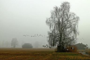 Keywords: flock of birds landscape fog haze atmosphere migratory birds geese wild geese nature tree birch goose bird swarm fly