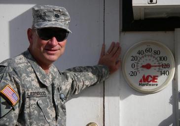 | Keywords: Florence County native set to return from overseas deployment DVIDS59692.jpg en How hot is it Florence County S C resident Lt Col Steven Liebenrood checks out a thermometer outside the headquarters of the Multi-National Division “ Baghdad at Camp Liberty in western Baghdad He is scheduled to return home in October after a 12-month military deployment with the 151st Field Artillery Brigade to Iraq For the past year Liebenrood has worked to improve logistical and administrative efforts of Iraqi army and Iraqi national police units stationed in Baghdad After a year in Baghdad Liebenrood said he is looking forward to being with his wife Lynn Russett Liebenrood and his two children Adam and Stephanie 2007-09-28 https //www dvidshub net/image/59692 59692 2007-09-28 08 51 BAGHDAD IQ PD-USGov Camp Liberty Images from DoD uploaded by Fæ |