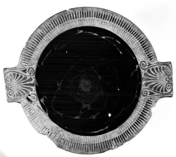 | Keywords: Florence Painter - Column Krater Depicting Symposiasts and a Satyr Dancing with Youths - Walters 4866 - Interior.jpg This red-figure column-krater depicts a symposium with three men on klinai and girl playing auloi On the left a bearded man lies on a kline chest frontal head to the right Only his upper half and half of the kline are shown He has a mantle draped around his left shoulder and waist and wears a thick fillet and wreath He gestures to his fellow banqueters Beneath him a table is visible and above on the wall on the left hangs a basket with covering cloth and on the right a flute case To the right is a girl playing auloi in chiton mantle thick fillet and wreath who stands in profile to the right playing auloi A bearded man and a youth lie on the next kline Both wear mantles thick fillets and wreaths in a fashion similar to the first two figures The man holds a phiale in his right hand and turns his head to the right towards the youth who faces and gestures toward him; a small kylix in black hangs from the right index finger of the youth Beneath them a table and footstool are visible; hanging above from left to right are a basket with covering cloth and a kylix All three support themselves by resting their left elbows on cushions The back depicts an old man dancing and two youths In the center a bearded balding potbellied man advances to the right as if dancing He raises his left foot high off the ground holds a stick in the air above his head in his right hand and extends his left hand out holding a mantle which is wrapped around his back and shoulders He wears a wreath and thick fillet and appears to have a string possibly an amulet around his right forearm On the left a mantled youth goes left looking around a staff in his right hand On the right another mantled youth moves left holding a staff out in his right hand The two youths have fillets ca 460 450 BC Classical terracotta cm 48 2 36 7 h x max diam ; at mouth cm 37 4 diam ; at rim cm 18 8 diam accession number 48 66 1243 Don Marcello Massarenti Collection Rome date and mode of acquisition unknown cat no 208 Henry Walters city Baltimore Walters Art Museum Henry Walters Acquired by Henry Walters with the Massarenti Collection 1902 place of origin Attica Greece Walters Art Museum license Ancient Greek red-figure pottery in the Walters Art Museum Florence Painter Media contributed by the Walters Art Museum needs category review Media contributed by the Walters Art Museum needs artist update |