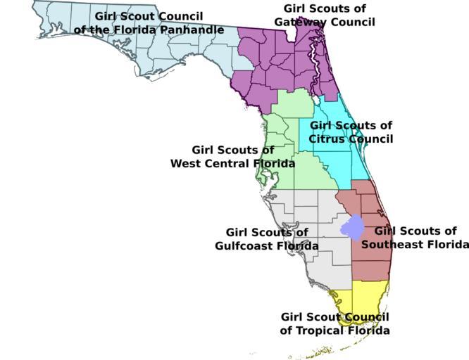 | Keywords: Florida-gsusa.svg Map of Girl Scout Councils in Florida my work based on Wikipedia county maps 2008-12-12 Emma Pease Erp Original upload log en wikipedia Florida-gsusa svg 2009-06-16 02 10 Erp 9521×7321× 675137 bytes <nowiki>Change to reflect council merger to form the new Panhandle council</nowiki> 2008-12-12 19 27 Erp 9521×7321× 676012 bytes <nowiki> Map of Girl Scout Councils in Florida my work based on the wikipedia county map for Florida 12-December-2008 Emma Pease </nowiki> Girl Scouts of the USA Council maps Scouting in Florida |
