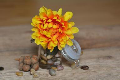 Keywords: flower art flower fabric flower blossom bloom yellow decorative glass jar stones wood deco decoration decorative