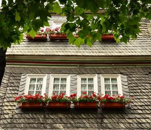 Keywords: flower boxes home window facade slate facade architecture old town old housewife building hauswand geranium