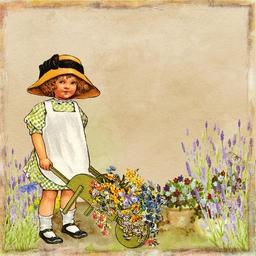 Keywords: flower garden vintage collage art watercolor little girl young child wheelbarrow hat small toddler green artistic artwork botanical card color colour creative decorative design drawing elegant flourish floral leaf nature painting playing