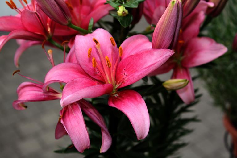 Keywords: flower lilies color stamp blossom bloom petal red pink