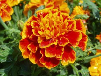 Keywords: flower marigold orange red summer flowerbed bright color head